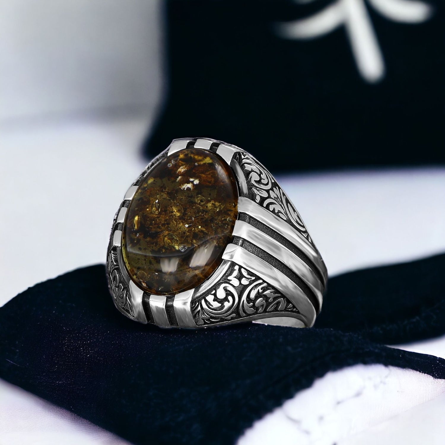 Tesbihevim | Men's Silver Ring with Fossil Drop Amber Stone - TryAladdin