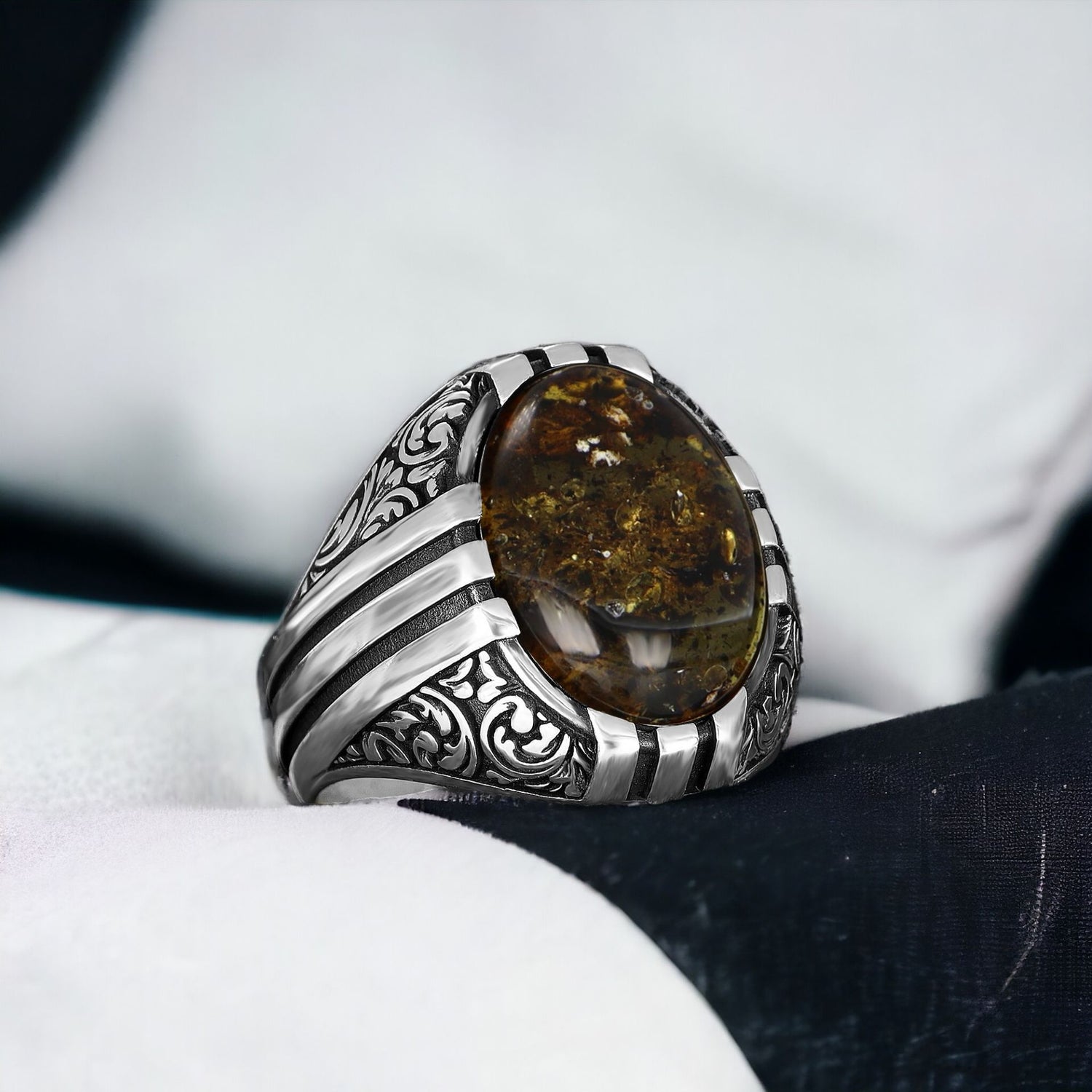 Elegance Meets Tradition with Men's Silver Ring with Fossil Drop Amber Stone