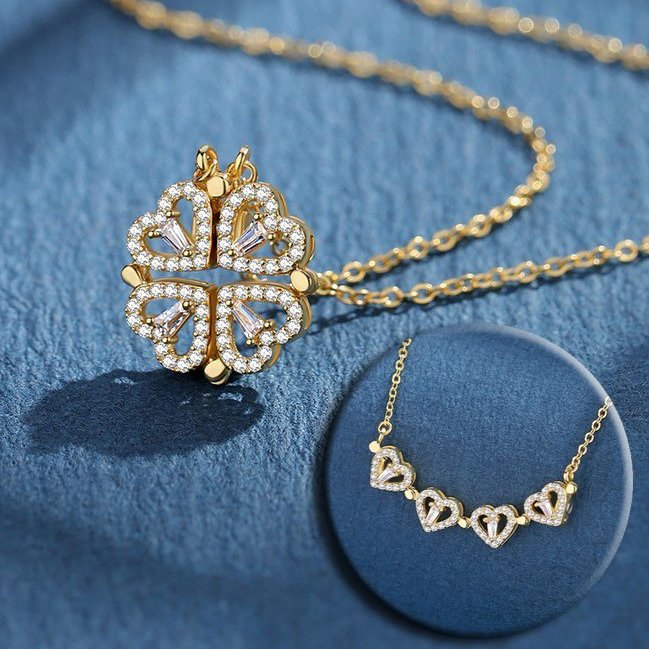 - Unique pendant transforms from a four-leaf clover to four sparkling hearts
