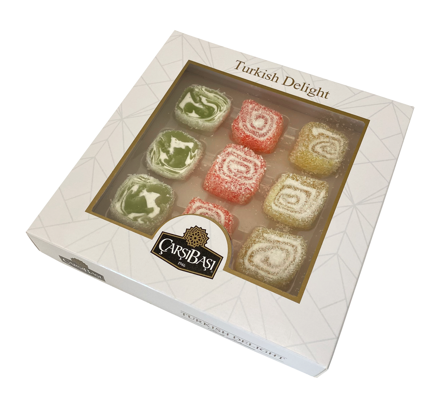Offrez une touche vibrante et moderne à une confiserie classique. Cette boîte à fenêtre Carsibasi de 300g contient 9 pièces de magnifiques loukoums 'Sarma' (roulés) fourrés à la crème, débordant de saveurs de fruits assortis.