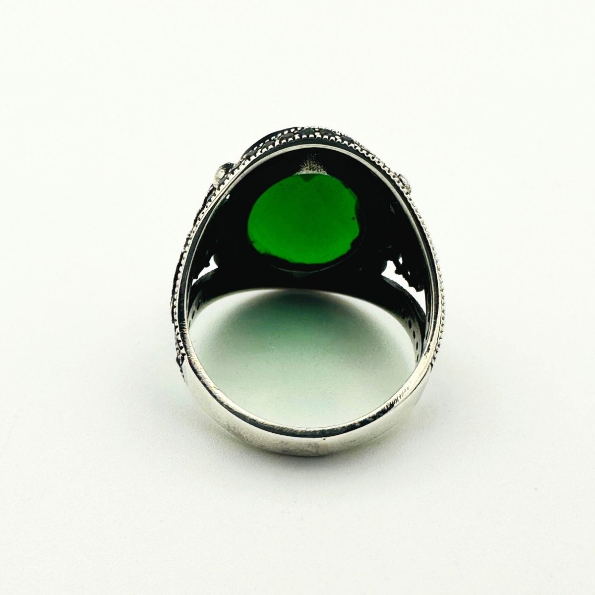 Ontdek de aantrekkingskracht van onze zilveren herenring met schorpioen-detail. Dit Turkse handgemaakte stuk heeft een groene smaragd zirconia steen, wat een vleugje elegantie en mysterie toevoegt. Of het nu een cadeau is voor een geliefde of een persoonlijke verwennerij, deze ring is een symbool van vakmanschap en stijl. Verhoog je accessoirecollectie met dit unieke handgemaakte item, zorgvuldig vervaardigd uit hoogwaardig sterling zilver. Val op met deze exquisite ring met schorpioen-detail en geniet van de essentie van individualiteit en verfijning in je stijl!