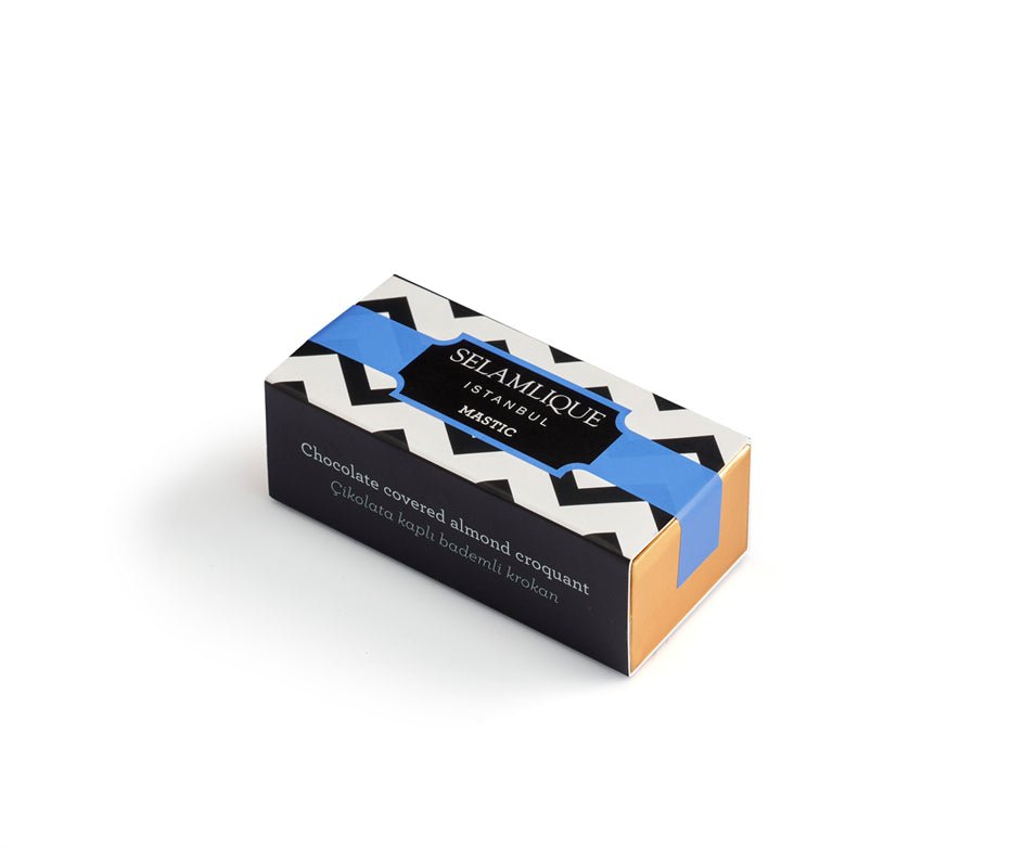 Een Selamlique delicatesse; amandel croquants bedekt met mastiek smaak chocolade in een ambachtelijke verpakking.
