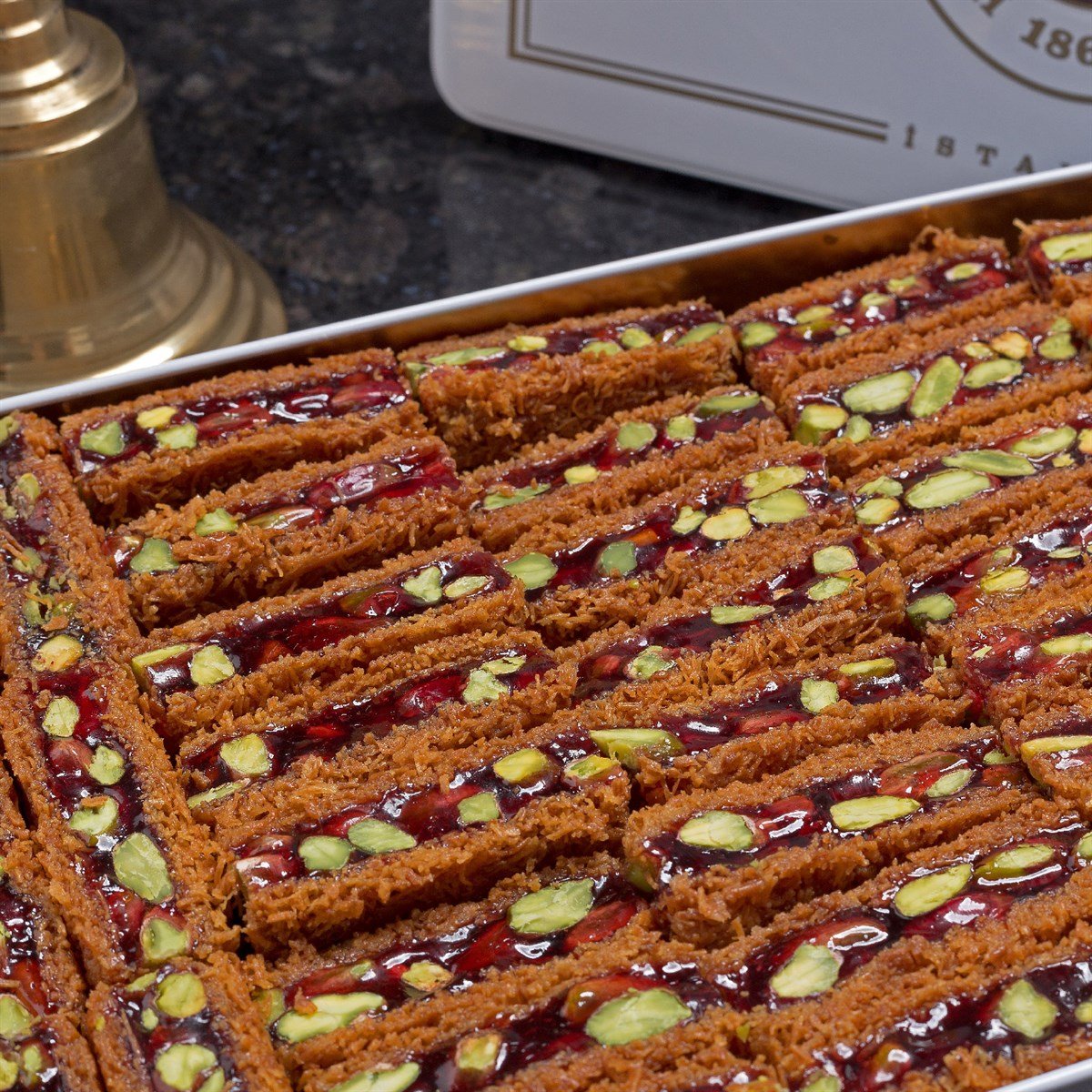 The Ottoman Kadayif with Pomegranate combines box a classic pomegranate Turkish delight with pistachios that is sandwiched between two layers of kayadif, made of shredded pastry dough. Together, they bring together the wonderful flavors of Turkish delight and kadayif into one delicious package.